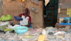 Assise en face de son étal, à la devanture d’une maisonnette lui servant de boutique, Maïmouna Hié attend ses premiers clients de la journée de ce mardi