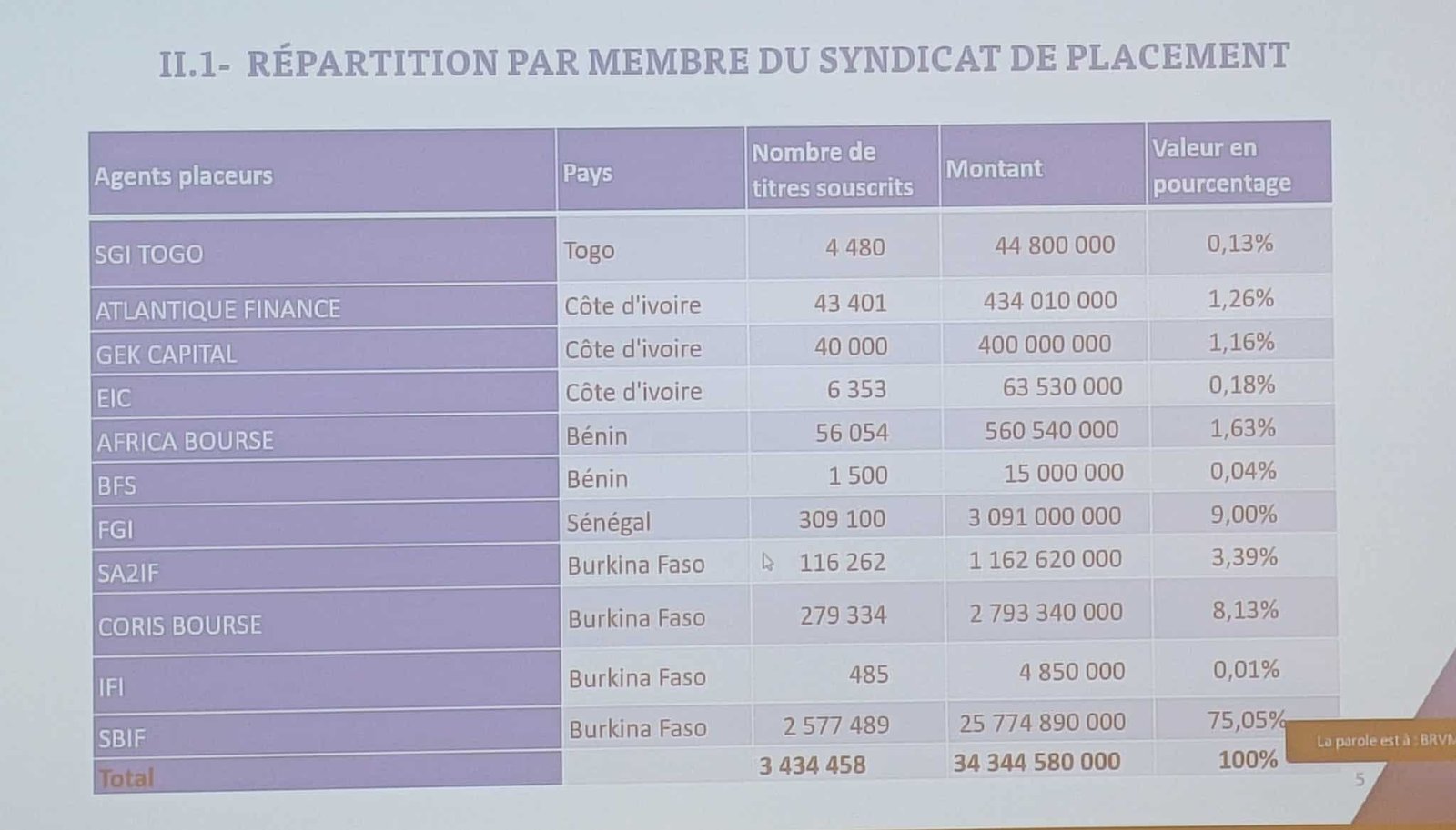 Sur un objectif initial de 30 milliards de FCFA, les souscriptions ont atteint 34 344 580 000  milliards de FCFA, soit un taux de souscription de 114 %, grâce à une large participation d’investisseurs de la zone UEMOA, mobilisés à travers une dizaine de Sociétés de gestion et d’intermédiation (SGI).