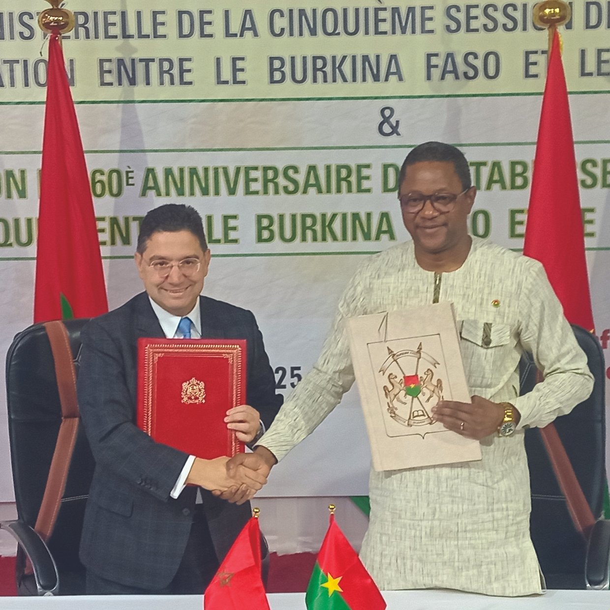 Le ministre des Affaires étrangères, de la Coopération régionale et des Burkinabè de l’extérieur, Karamoko Jean-Marie Traoré et son homologue du Maroc, Nasser Bourita, ont présidé la réunion ministérielle de la 5e commission mixte de coopération entre les deux pays, mercredi 10 décembre 2025, à Ouagadougou. A l’occasion, ils ont signé 12 nouveaux accords de coopération.