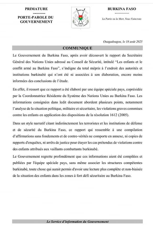 Le gouvernement du Burkina Faso a exprimé son indignation face au rapport du Secrétaire général des Nations Unies présenté au Conseil de sécurité et intitulé « Les enfants et le conflit armé au Burkina Faso ». Selon l’Exécutif, ce document a été élaboré sans la participation ni la consultation des autorités nationales, ce qui remet en cause sa crédibilité.