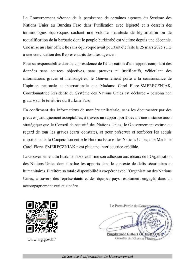 En conséquence, le gouvernement a annoncé que Madame Carol Flore-Smereczniak est désormais déclarée persona non grata sur le territoire burkinabè, estimant qu’elle « n’est plus une interlocutrice crédible » dans le cadre de la coopération avec les Nations Unies.