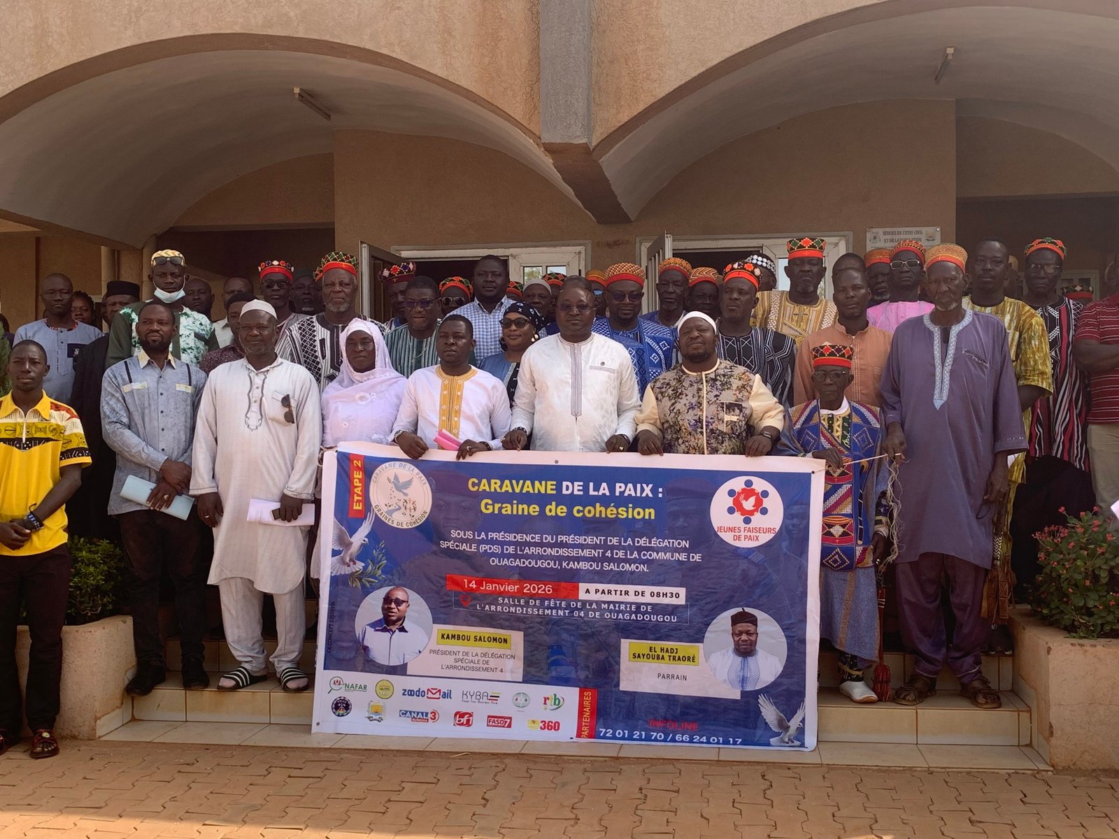 La salle des fêtes de la mairie de l’Arrondissement 4 de Ouagadougou a accueilli ce mercredi 14 janvier 2026 le lancement officiel de la deuxième étape de la Caravane de la paix, placée cette année sous le thème «Ensemble bâtissons une paix durable au Burkina Faso». L’événement a rassemblé autorités locales, leaders communautaires, jeunes et chefs coutumiers autour d’un objectif commun : promouvoir le dialogue, la tolérance et le vivre-ensemble.
