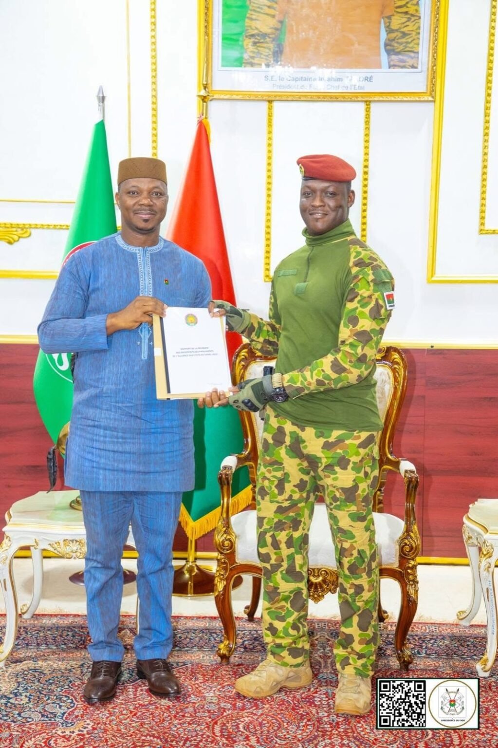 (Ouagadougou, 19 septembre 2025)Le Président du Faso, Capitaine Ibrahim TRAORÉ, a reçu ce vendredi les présidents des parlements du Mali, du Niger et du Burkina Faso, réunis dans le cadre des travaux préparatoires de la Confédération des États du Sahel (AES).