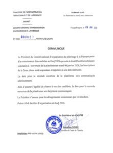 Le Président du Comité national d’organisation du pèlerinage à la Mecque porte à la connaissance des candidats au Hadj 2026 que suite à des difficultés techniques constatées à l’ouverture de la plateforme ce mardi 06 janvier 2026, les inscriptions de la 2ème phase sont suspendues et reportées à une date ultérieure.