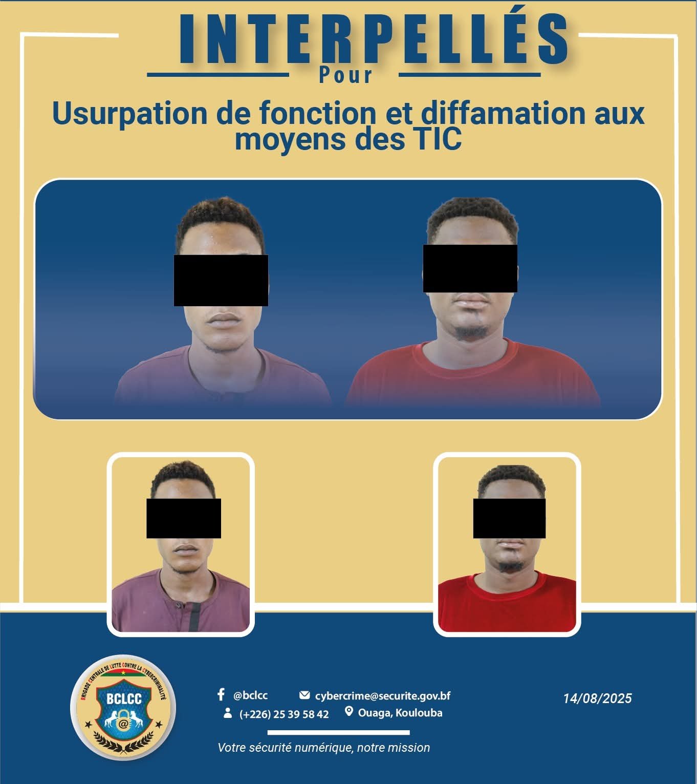 Dans le cadre de sa mission de protection des personnes et de leurs biens dans le cyberespace burkinabè, la Brigade Centrale de Lutte Contre la Cybercriminalité (BCLCC) a interpellé deux individus pour des faits d’usurpation de fonction et de diffamation commis au moyen des technologies de l’information et de la communication.