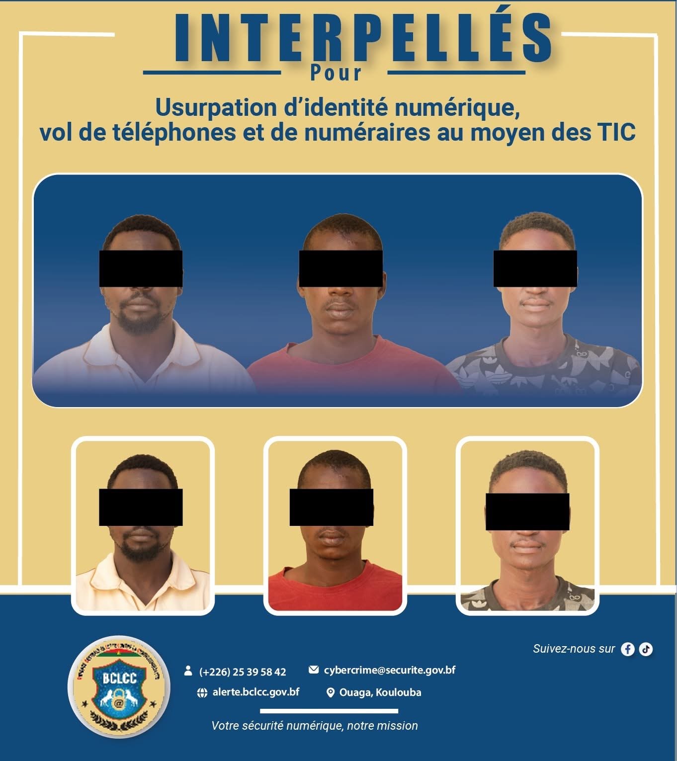 Dans le cadre de ses missions de protection des personnes et de leurs biens dans le cyberespace burkinabè, la Brigade Centrale de Lutte Contre la Cybercriminalité (BCLCC) a mis fin aux activités de trois (03) présumés auteurs des faits de vol de téléphones portables et de soustraction frauduleuse de numéraires via les Technologies de l’Information et de la Communication (TIC).